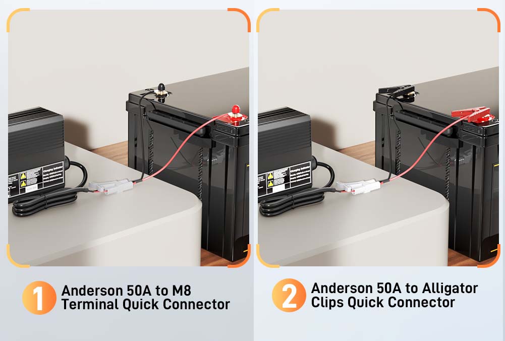 Wir bieten jeweils einen Anderson 50A auf M8 Terminal Adapter und einen Anderson 50A auf Krokodilklemmen Adapter an. Die Kabel unterstützen Ströme von 20A, 30A, 40A und 50A, mit einer Kabellänge von 30 cm. Bitte wählen Sie entsprechend Ihrem Anwendungsfall.