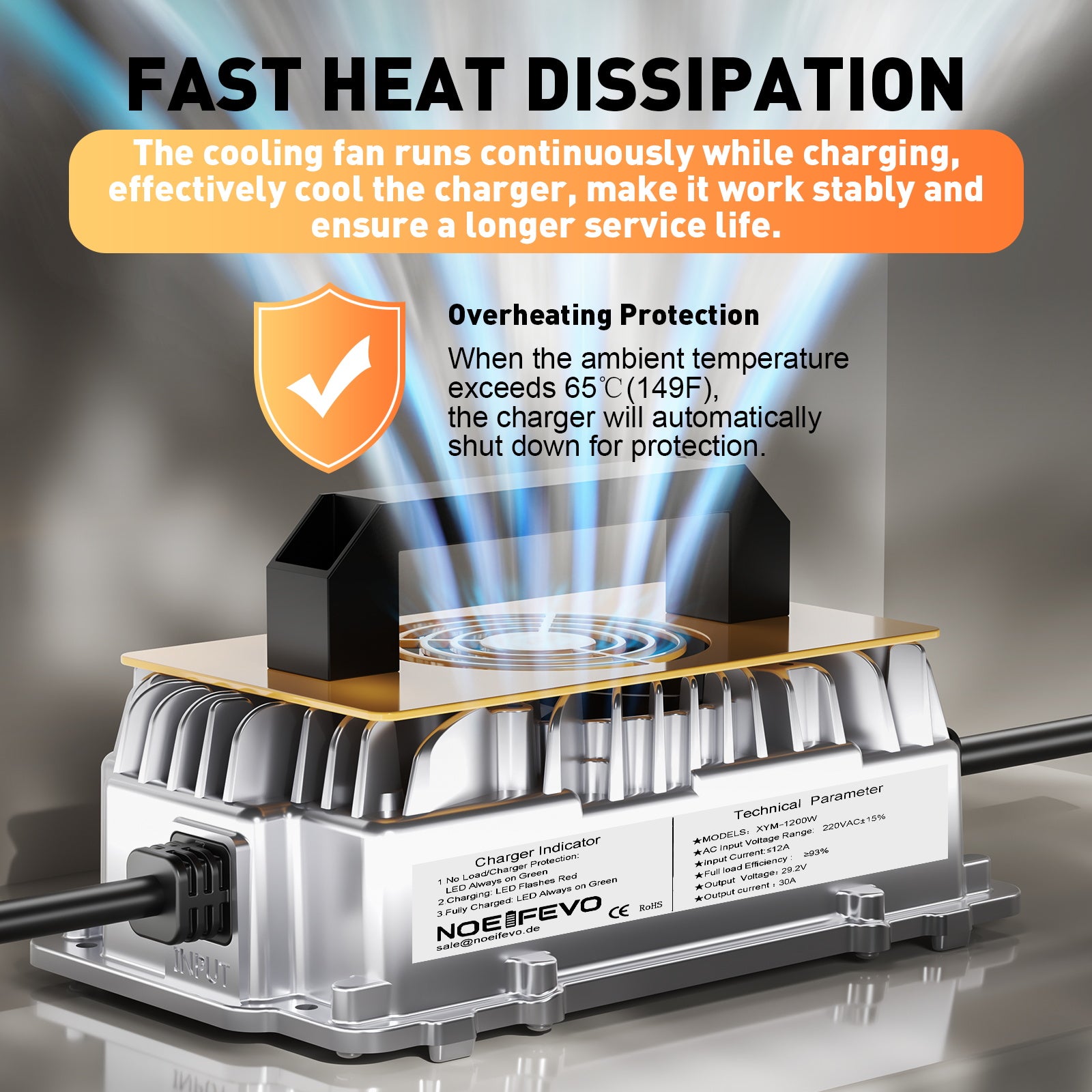 Noeifevo 29,2 V 30 A LiFePO4 Caricabatterie  per batteria al litio 24 V 25,6 V, impermeabile, attivazione BMS 0 V, spegnimento automatico
