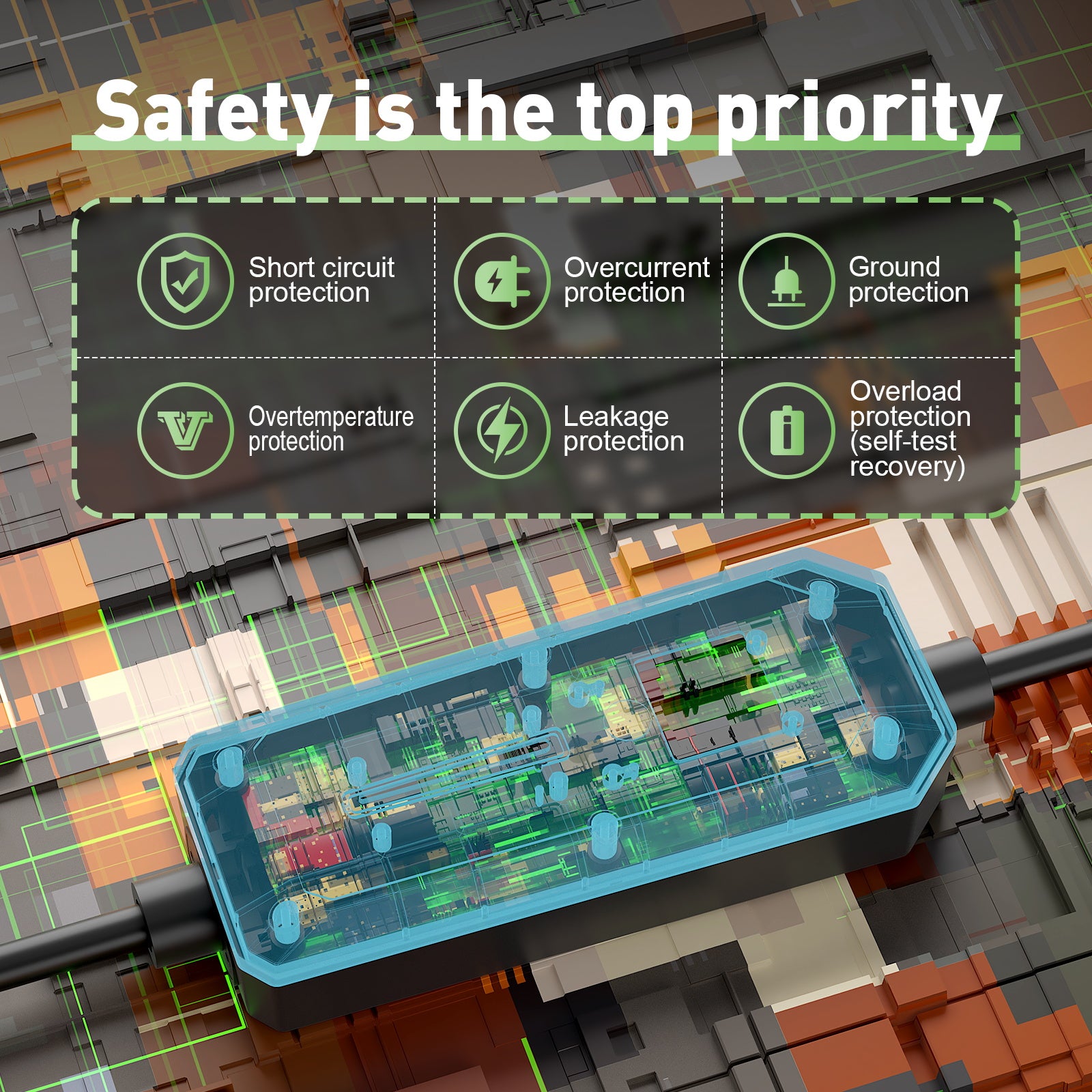 Verfügbare Stromstufen sind: 6A/10A/13A/16A, die entsprechende Ladeleistung beträgt jeweils 1,32 kW / 2,2 kW / 2,86 kW / 3,68 kW (tatsächliche Leistung kann aufgrund von Energieverlusten und dem Leistungsfaktor variieren). Wenn ausreichend Ladezeit vorhanden ist, können niedrigere Leistungen gewählt werden; bei dringendem Ladebedarf kann eine höhere Leistung gewählt werden. Diese flexible Ladeweise erfüllt nicht nur die Anforderungen unterschiedlicher Szenarien, sondern ist auch die beste Wahl zur Verlängerung der Lebensdauer der Fahrzeugbatterie. Wenn die elektrischen Leitungen zu Hause alt sind oder die Schutzklasse in der Garage niedriger ist, können Sie die Ausgangsleistung des Ladegeräts anpassen, um eine sichere und zuverlässige Ladung zu gewährleisten.